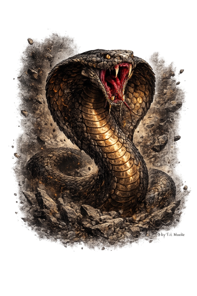 Dieses eindrucksvolle Cobra-Motiv vereint Dynamik, Stärke und bedrohliche Eleganz in einem hochdetailierten Design. Die aufgerichtete Schlange mit gespreizter Haube, geöffnetem Maul und markanter Schuppenstruktur wirkt kraftvoll und intensiv – ein echtes Statement-Motiv für außergewöhnliche Textilprojekte. Die realistische Darstellung mit dramatischen Effekten verleiht dem Design Tiefe und Präsenz und sorgt für maximale Aufmerksamkeit auf jedem Shirt.